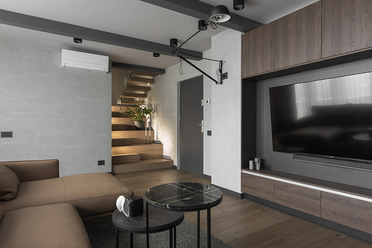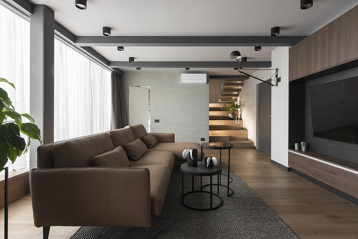 Structura de oțel necesară pentru susținerea etajului, integrată în amenajare, a contribuit prin aspect, dimensiune și nuanța mată de gri închis, la caracterul dinamic al spațiului. Golul de scară a devenit un spațiu sculptural, scara în sine captivând privirea aidoma unui obiect de decor, invitând la o experimentare tactilă și chinestezică.