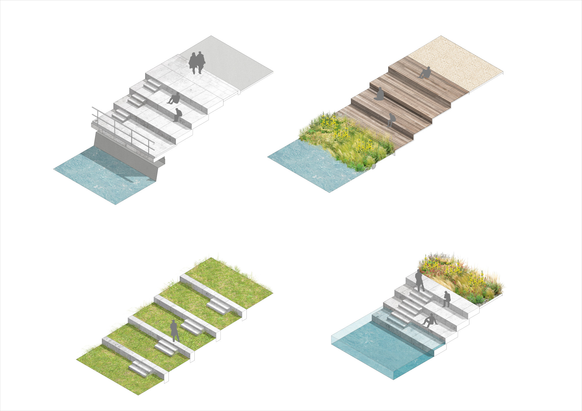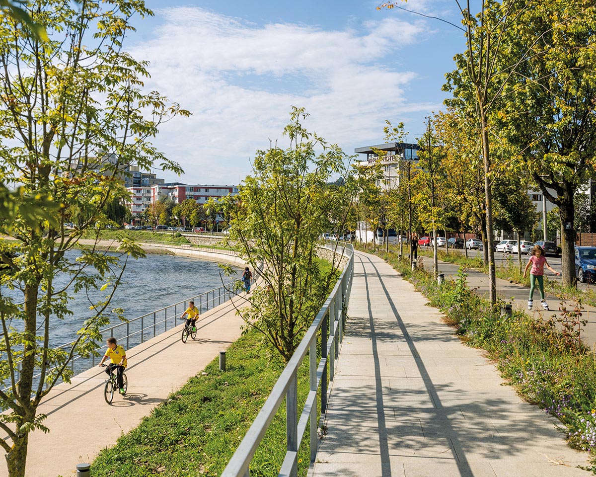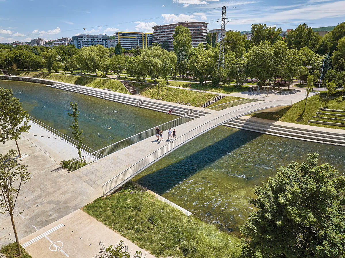 Someșul devine un „coridor verde” ce susține o întreagă infrastructură a mobilității și accesibilității, formată dintr-o rețea de trasee, piste de biciclete și poduri pietonale. Cursul râului a fost extins atât pentru a găzdui și încuraja biodiversitatea (prin floră locală, pietre, nisip), cât și pentru a crea noi spații publice, de relaxare și interacțiune: parcări transformate în piațete cu vedere la apă, maluri cu plaje și gradene integrate. Acestora li se adaugă un sistem de terase ce contribuie la renaturalizarea mediului, la formarea unui microclimat optim și la absorbția de CO2.