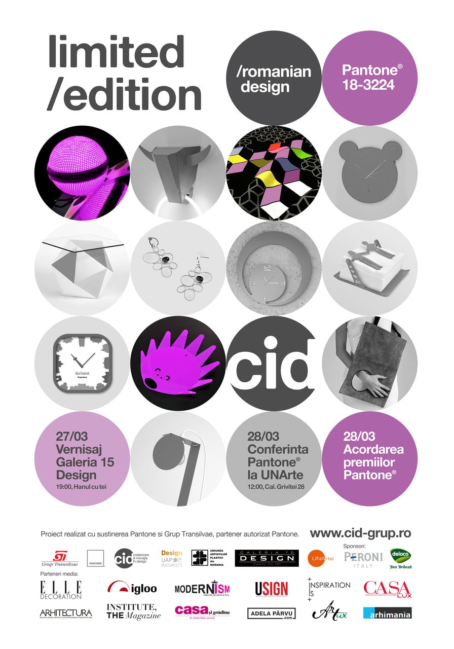 Vernisajul expoziţiei „limited edition / romanian design” Pantone® 18-3224 va avea loc pe data de 27 Martie în cadrul Galeriei 15 Design – Hanul cu Tei, ora 19:00. Expoziţia, având ca temă culoarea anului 2014 – PANTONE ® 18-3224 Radiant Orchid – este o colecţie de grup cu obiecte create atât de membrii CID Grup cât şi de designerii selectaţi în urma apelului la proiecte lansat de membrii grupului în luna ianuarie. Printre aplicaţiile selectate se numără lucrările designerilor: Adrian Balcău, Alis Lalu, Andreia Gabriela Popescu, Andrei Ştefănescu şi Elena Ştefănescu, Dragoş Motică, Ioana Streza, Roxana Mitarcă. Un preview al lucrărilor acestora poate fi accesat aici: http://cid-grup.ro/radiant.html