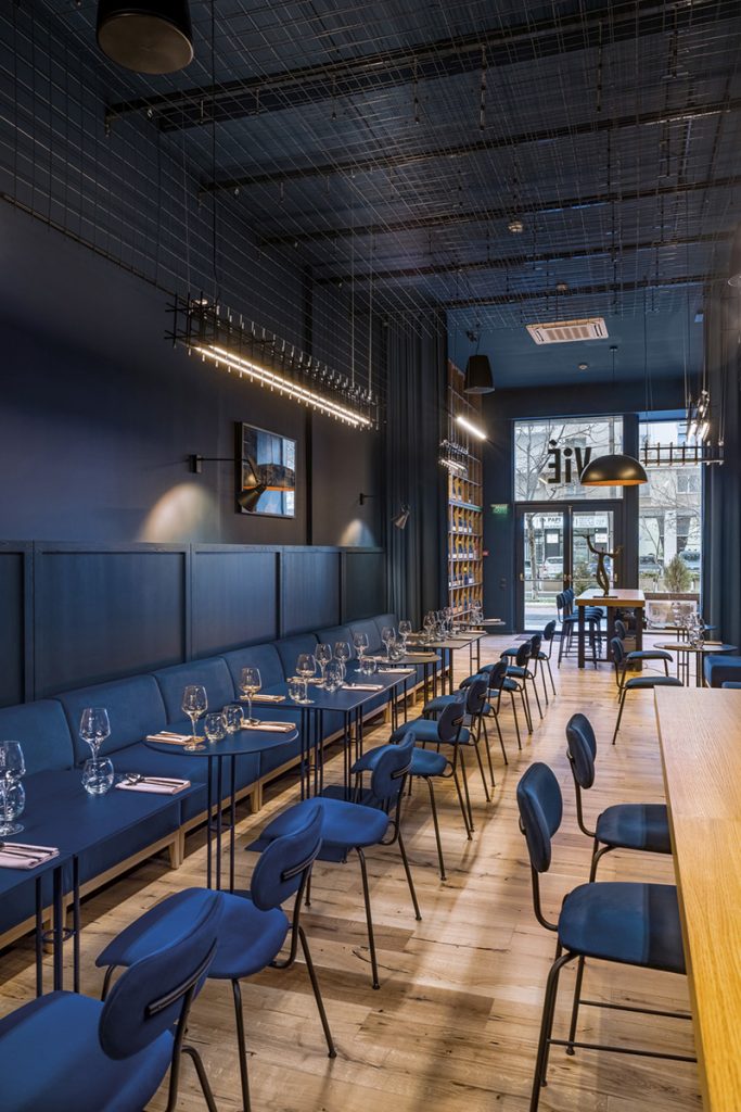 Cu un nume sugestiv, care trimite la amprenta viticolă a demersului și la originile franțuzești ale grupului Tamara, plus un accent demn de a-i evidenția personalitatea, Vié își întâmpină oaspeții cu eleganță în spațiul îngust-lung și amplu pe care echipa coordonată de arh. Justin Baroncea (autori: arh. Mihai Barbu, arh. Maria Ghement, arh. Justin Baroncea; coautori: arh. Emanuel Birtea, arh. Andrei Angelescu) l-a definit sub auspiciile unui albastru intens, utilizat parietal și în cazul mobilierului. O draperie generos teatrală în aceeași nuanță separă zona de restaurant de cea de wine shop de la intrare, pe ale cărui rafturi până la tavan se concentrează o selecție de vinuri craft – producții mici, crame care respectă natura și ritmurile ei – în special din Europa Centrală și de Vest.