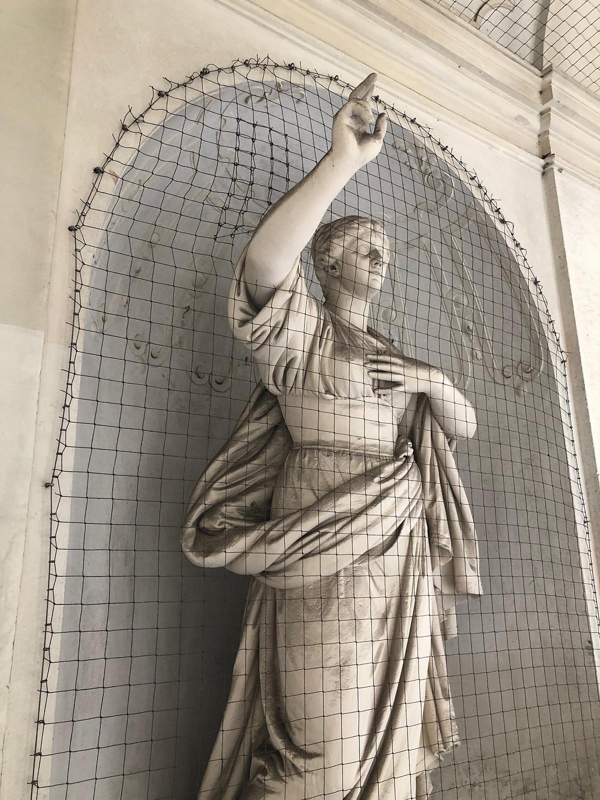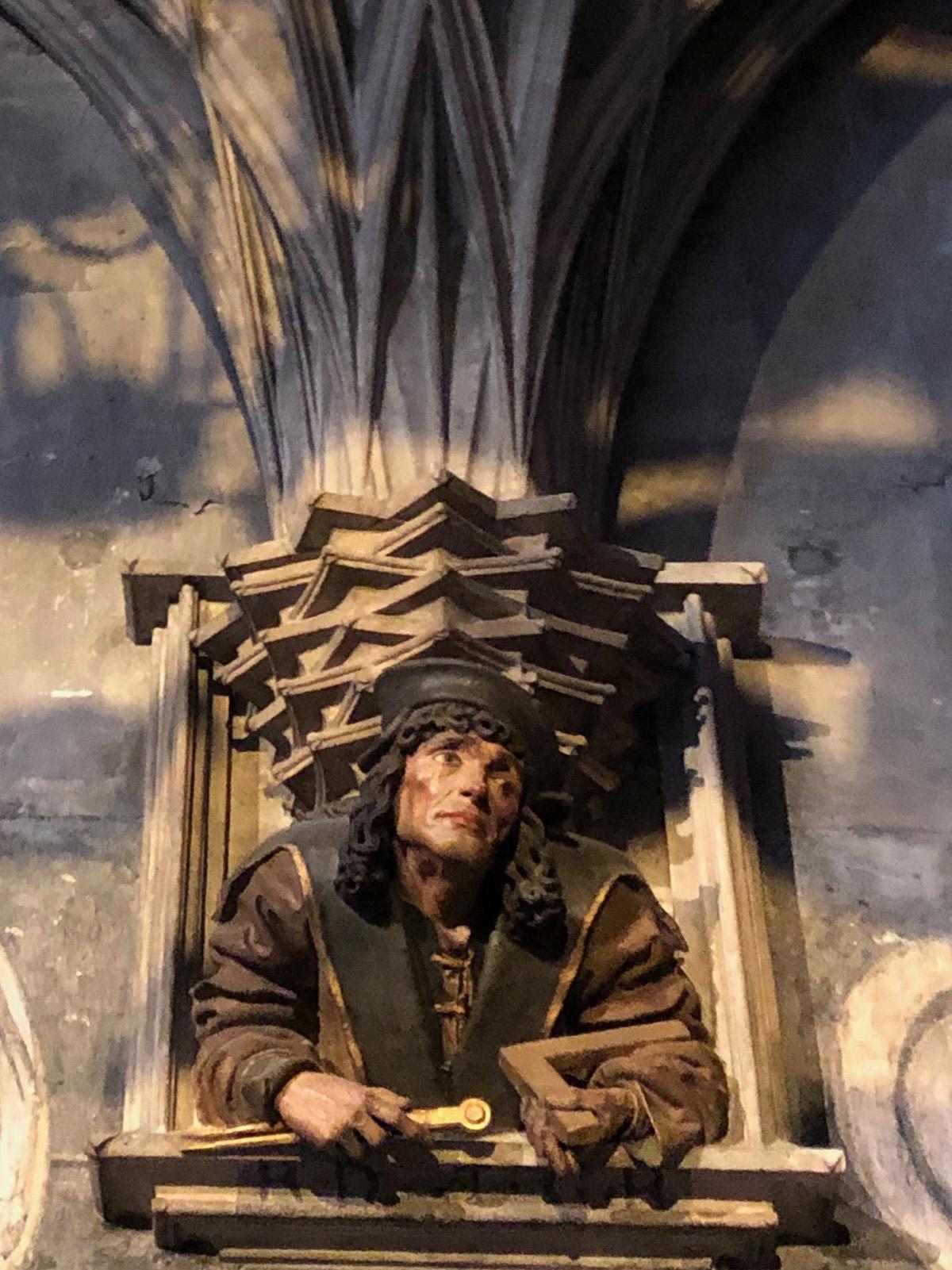 Prezența temporară a instalației face din catedrală o scenă vie, deschisă, dinamică. Lăcașul este plin de turiști, fiecare își caută cele mai potrivite poziții pentru a imortaliza impresiile fugare. Dintr-o latură, îmi atrage atenția figura celui care pare că simbolizează constructorul minunatului edificiu: de secole își contemplează smerit, dar curios opera și efectul ei asupra celor care se perindă pe acolo. Martor tăcut al multor mari și mici evenimente, oare câte secrete cunoaște și câte ar avea de povestit? Pe acoperișul catedralei se poate ajunge fie cu liftul dinăuntru printr-un turn, fie pe jos pe dinafară printr-un alt turn.