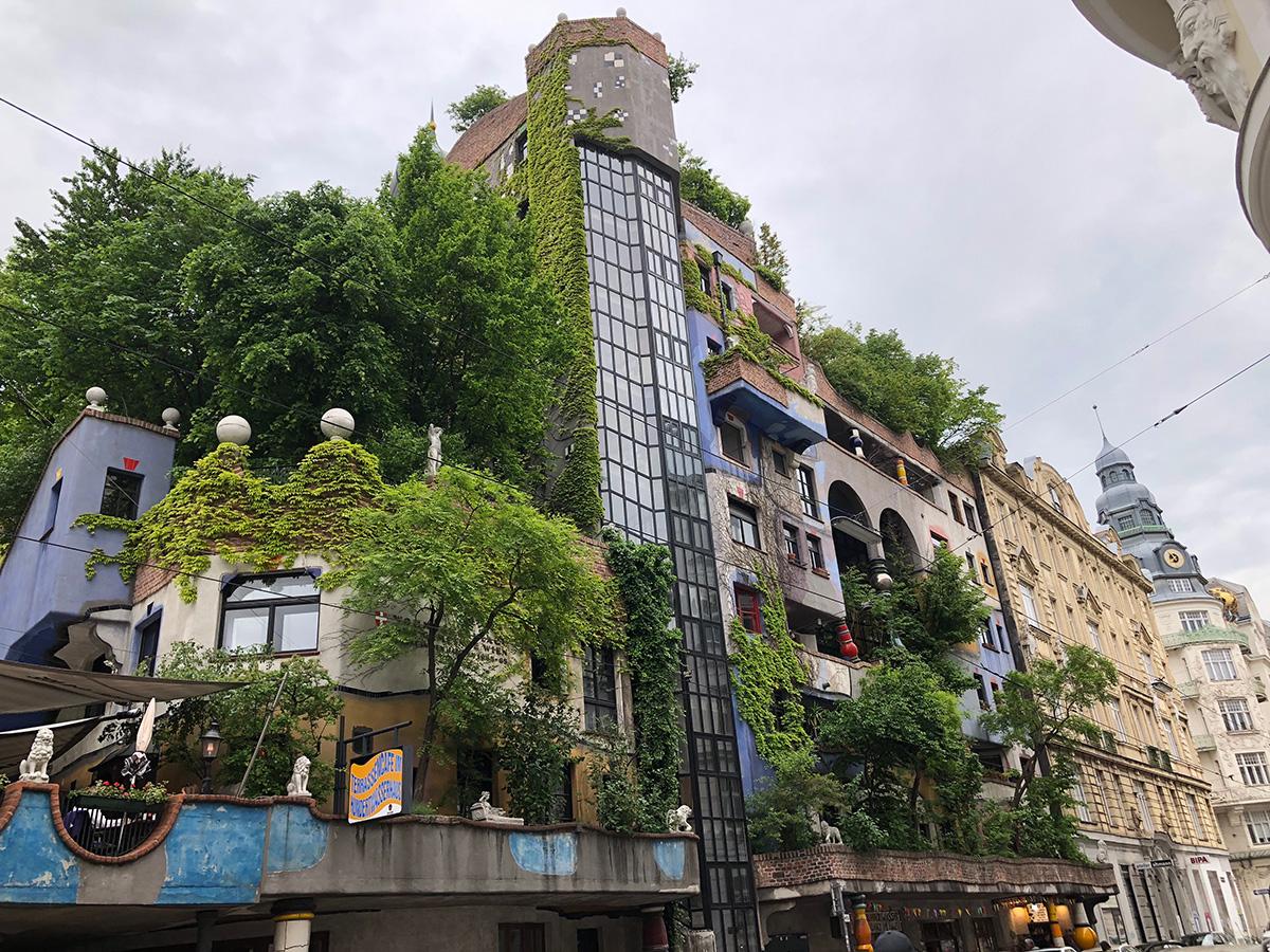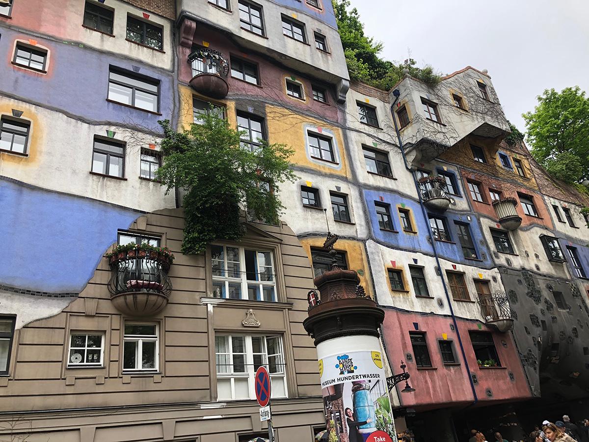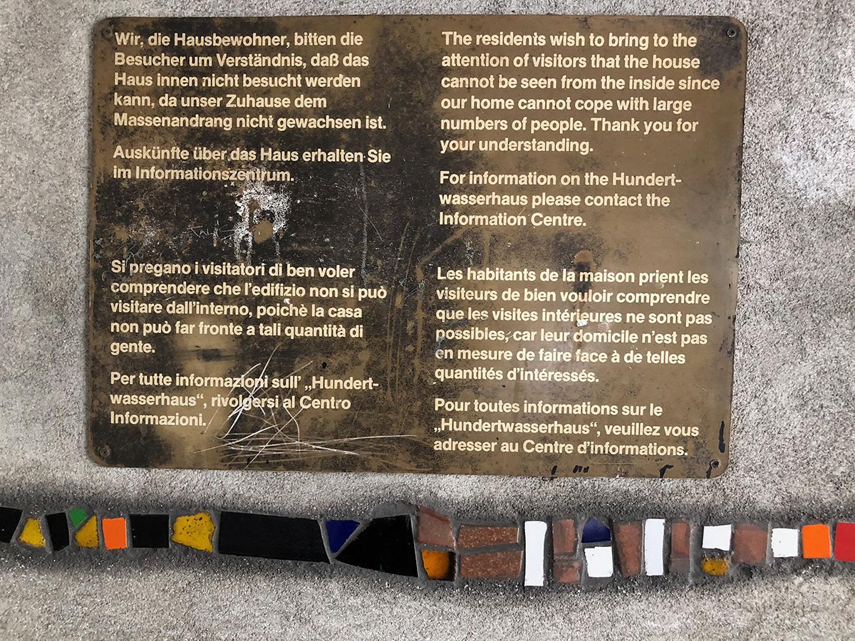 Mai departe, după o plimbare pe o stradă artistic decorată, ajung la casele lui Hundertwasser înconjurate de o mare de turiști curioși. La intrarea în imobil, un anunț în patru limbi imploră respectarea spațiului privat al locatarilor…
