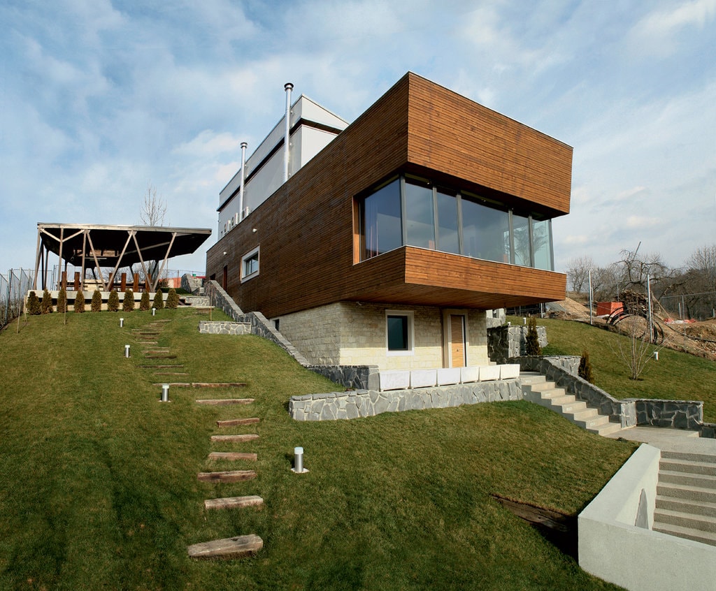 Casa cu siluetă modernistă se aşază firesc pe terenul în pantă, înălţându-se uşor pe verticală. Solul stâncos (valorificat cu inspiraţie în camera de la parter, devenită cramă) nu a permis prea multe intervenţii, de aceea spaţiile urmează conştiincios linia naturală. Singura abatere o reprezintă livingul: ieşirea îndrăzneaţă în consolă nu afectează însă silueta casei graţie structurii metalice pentru care s-a optat.
