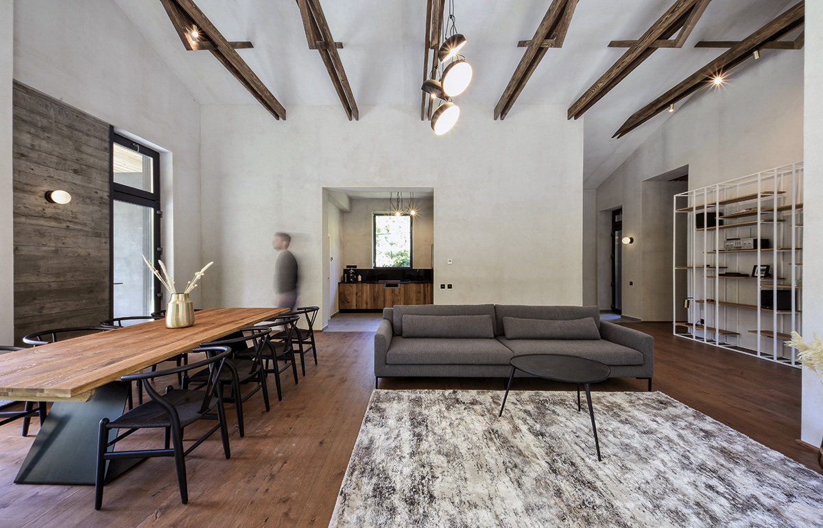 La interior, sobrietatea materialelor este îmblânzită treptat grație alegerii unor texturi compoziționale calde și primitoare. Livingul și a sa deschidere vitrată generoasă către exterior întâmpină cu o atmosferă relaxantă conturată la întâlnirea dintre căldura lemnului (pardoseală, mobilier) și accentele cromatice neutre ale textilelor și obiectelor decorative. Iluminatul se etalează într-un joc al elementelor plafonului sau în ipostaza unor aplice. Subtile siluete metalice (biblioteca, măsuțele de cafea) își fac apariția, punctând aerul modern al ansamblului. Robustă și lungă, masa de dining este în același timp o invitație și o promisiune a viitoarelor adunări conviviale. Din living se zărește și bucătăria, al cărei mobilier reia cromatic liniile generale ale zonei de dining și de relaxare.