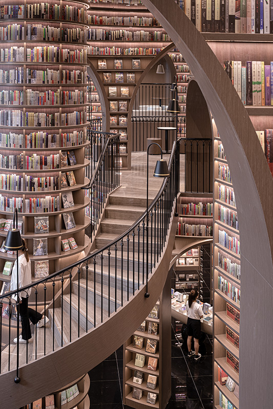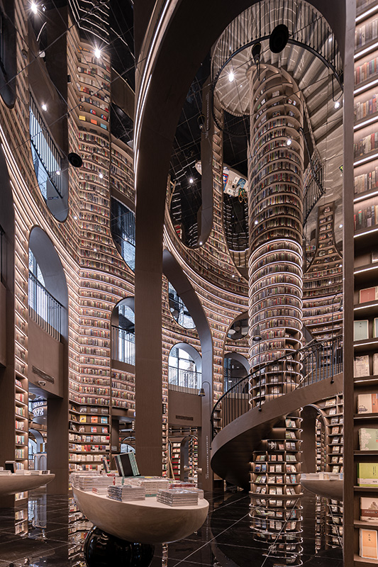 În caz că v-ați întrebat vreodată cum ar putea arăta biblioteca mănăstirii din Numele trandafirului combinată cu biblioteca secretă din seria Cimitirul cărților uitate, ar trebui să călătoriți până la Chengdu, Sichuan, în China, și să deschideți ușa recent inauguratei librării Dujiangyan Zhongshuge. Echipa X+Living a pus în operă aici o librărie-pădure labirintică, ce pare desprinsă din visul celui mai avid cititor. Nenumărate cărți și-au găsit loc pe rafturile în formă de litera C, iar în zona centrală dedicată literaturii a fost utilizată oglinda la nivelul plafonului pentru a crea iluzia optică a unei librării care se propagă la infinit. Din punctul în care mâna vizitatorului nu se mai poate întinde pentru a alege o carte, a fost utilizată soluția unui tapet livresc, care dă senzația rafturilor pline până în plafon.
