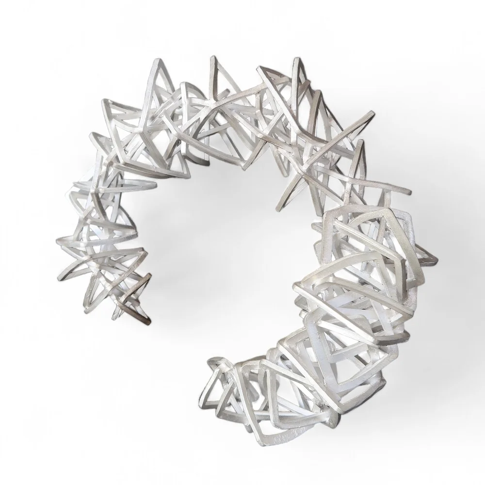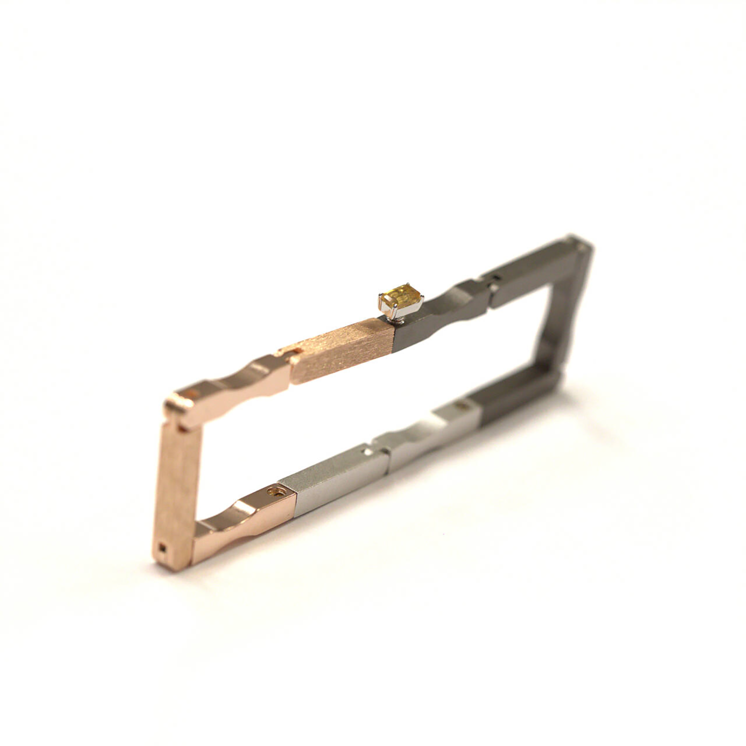 Inspirat de hărți topografice și teorii despre Pământul plat, Gengxue Zheng creează bijuterii cu efecte tridimensionale din linii bidimensionale. Lucrările sale provoacă percepția vizuală și interacțiunea cu purtătorul.