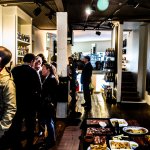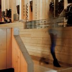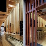 The frames and their rhythm enlarge the space and transform its scale. The interior of the bar includes three levels – access level, mezzanine and underground – and has a telescopic shape, emphasized by the long bar counter which starts from the entrance, with the wine display area, and continues with the food display and tapas preparation area and, also, with the DJ place. Besides the wooden frames, the décor is kept to a minimum. Only wine bottles – a full wall of them – and a nice touch of color for the façade (afizélia wood, the same essence we find in Siza’s Boa Nova).