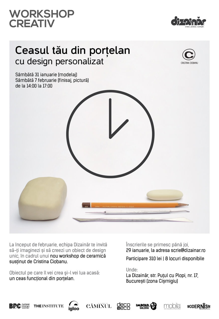 Sub îndrumarea Cristinei, ideile cursanților urmează să fie desenate, decupate, modelate în gresie și porțelan, pictate, glazurate, și, în final, scoase din cuptor. Obiectul pe care fiecare participant îl va crea şi-l va lua acasă: un ceas funcțional din porțelan.
