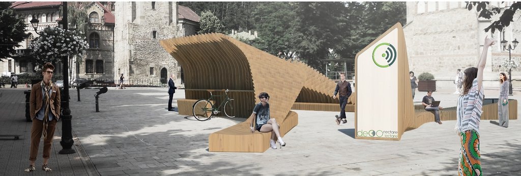 “DECO – conectare, colectare”, cel mai creativ proiect de amenajare al zonei eco wi-fi şi câştigătorul premiului întâi al competiţiei s-a remarcat printr-un design cu forme şi materiale organice articulate. El are la bază principiul echilibrului om-natură şi este realizat în totalitate din lemn, având o formă modernă, inedită. Spaţiul propune locuri de relaxare, suporturi pentru biciclete, acces la internet prin wi-fi gratuit, panouri fotovoltaice şi zone de colectare separată a deşeurilor de ambalaje. Realizatorii acestui proiect, câştigătorii concursului Eco Wi-Fi Zone Design şi al premiului de 1.500 de euro sunt Andrei Denisa Johanna, Mihai Brad şi Vlad Popa, toţi actuali arhitecţi şi foşti studenţi ai Facultăţii de Arhitectură din cadrul Universităţii Ion Mincu, Bucureşti.